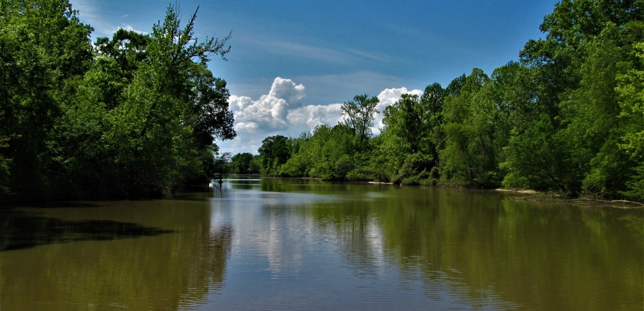 The view of the river is wonderful and clear showing its banks and channels. The blue sky with clouds provides the perfect reflections of the river. There are trees and undergrowth on each side of the river providing shade and food for the wildlife in the area. The river feeds the Ross Barnett reservoir which can be seen in full a few miles from this spot.